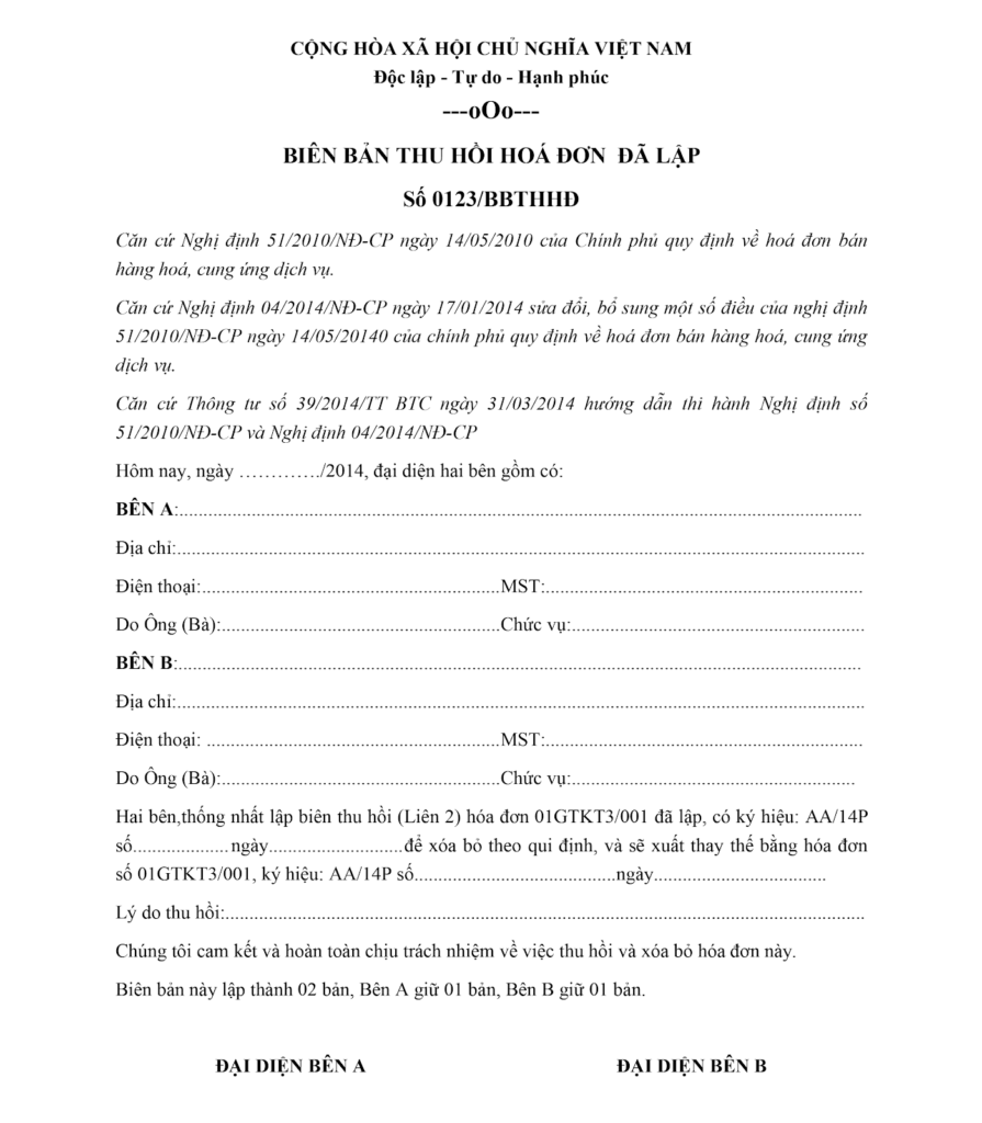 Biên bản thu hồi hóa đơn điện tử